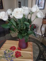 This morning, I removed three, changed the water, and cut their stems one last time. I put sugar into the water (I could not figure out the bleach or vinegar suggestion). I placed a rubber band around the remaining 9 roses, and they are on the kitchen counter – still looking sad but hanging in there.